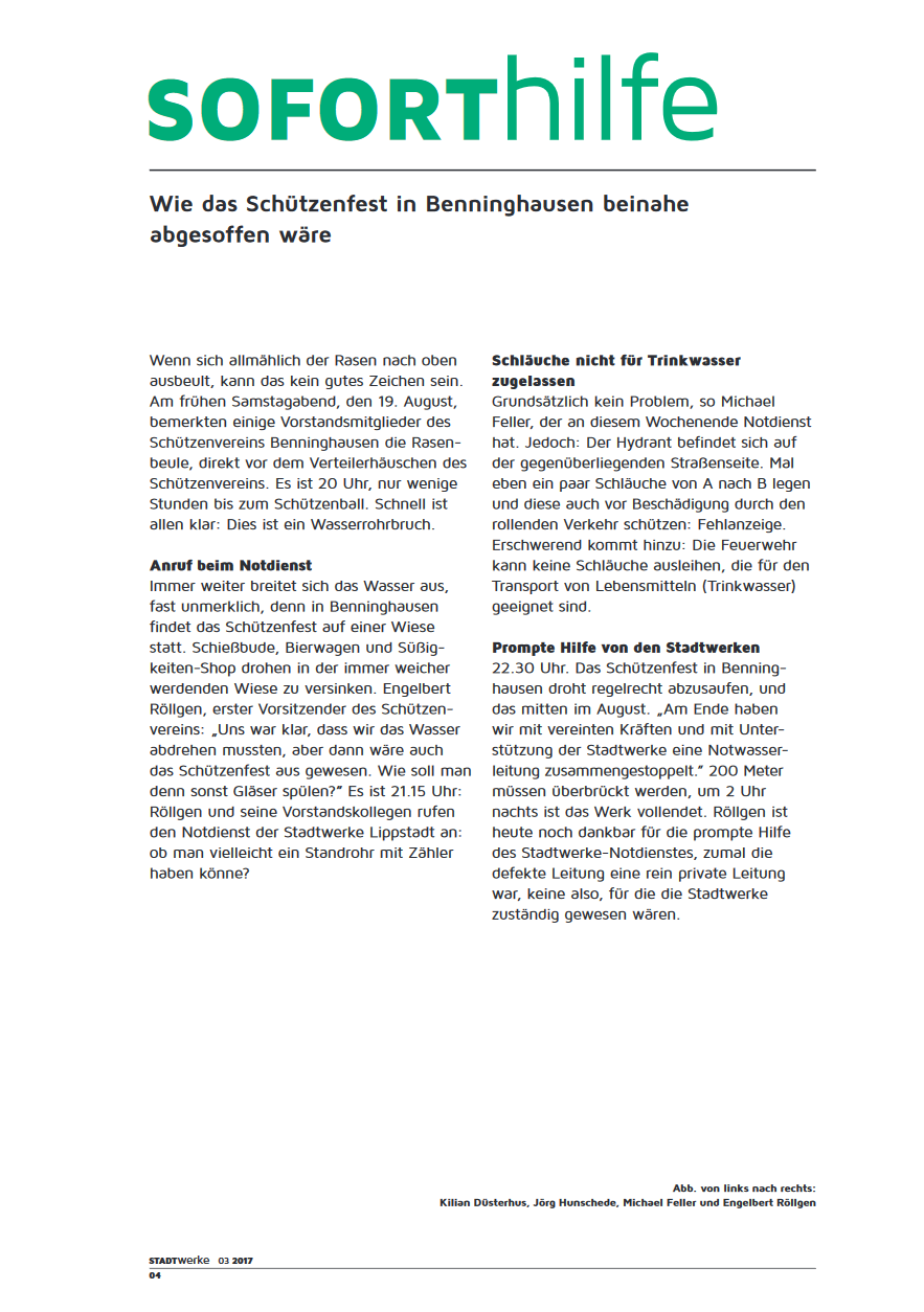 Neben engagierten Schützenbrüder, haben uns am Schützenfest Samstag auch die Stadtwerke Lippstadt tatkräftig bei unserem "Wasserproblem" unterstützt. Die Stadtwerke Lippstadt nahmen dies zum Anlass einen ausführlichen Bericht im Stadtwerke Kundenmagazin (Ausgabe 3/2017) zu veröffentlichen, welchen wir gerne mit euch teilen möchten.