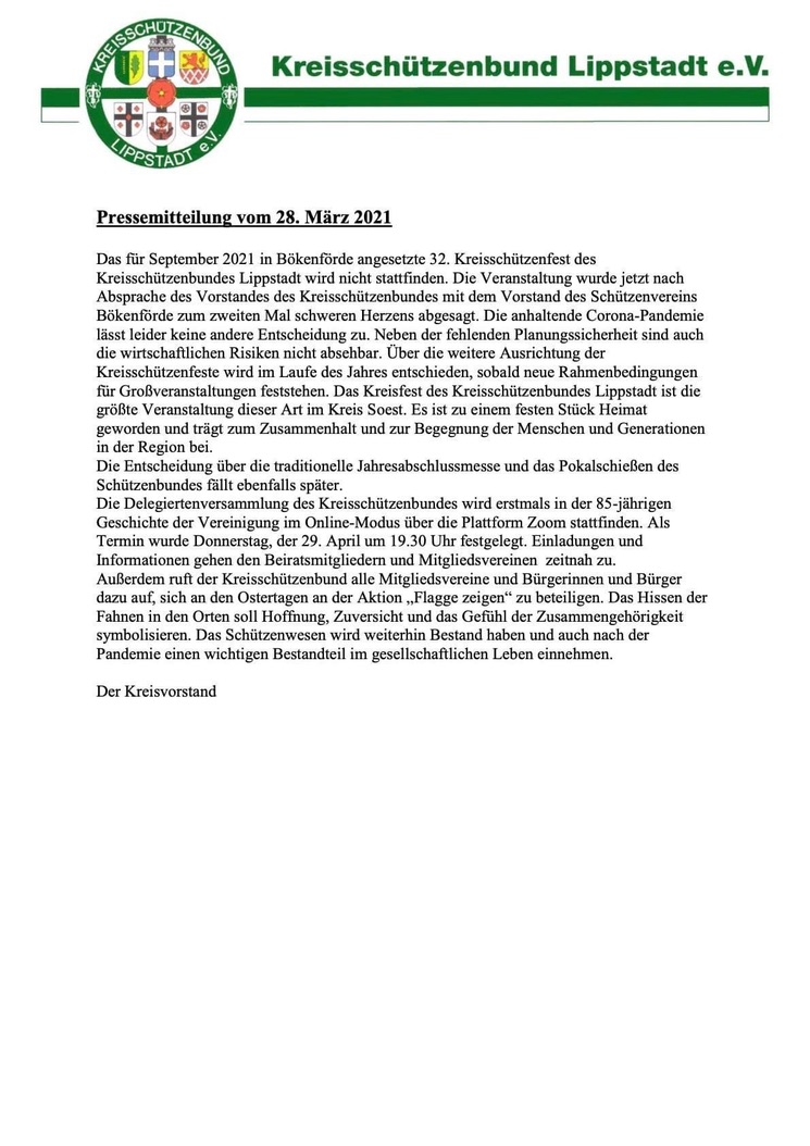Der Kreisschützenbund Lippstadt ruft in einer Pressemitteilung vom 28.03.2021 wie bereits im vergangenen Jahr dazu auf, sich während der Ostertage an der Aktion "Flagge zeigen" zu beteiligen. Das Hissen der Fahnen in den Orten soll Hoffnung, Zuversicht und das Gefühl der Zusammengehörigkeit symbolisieren.